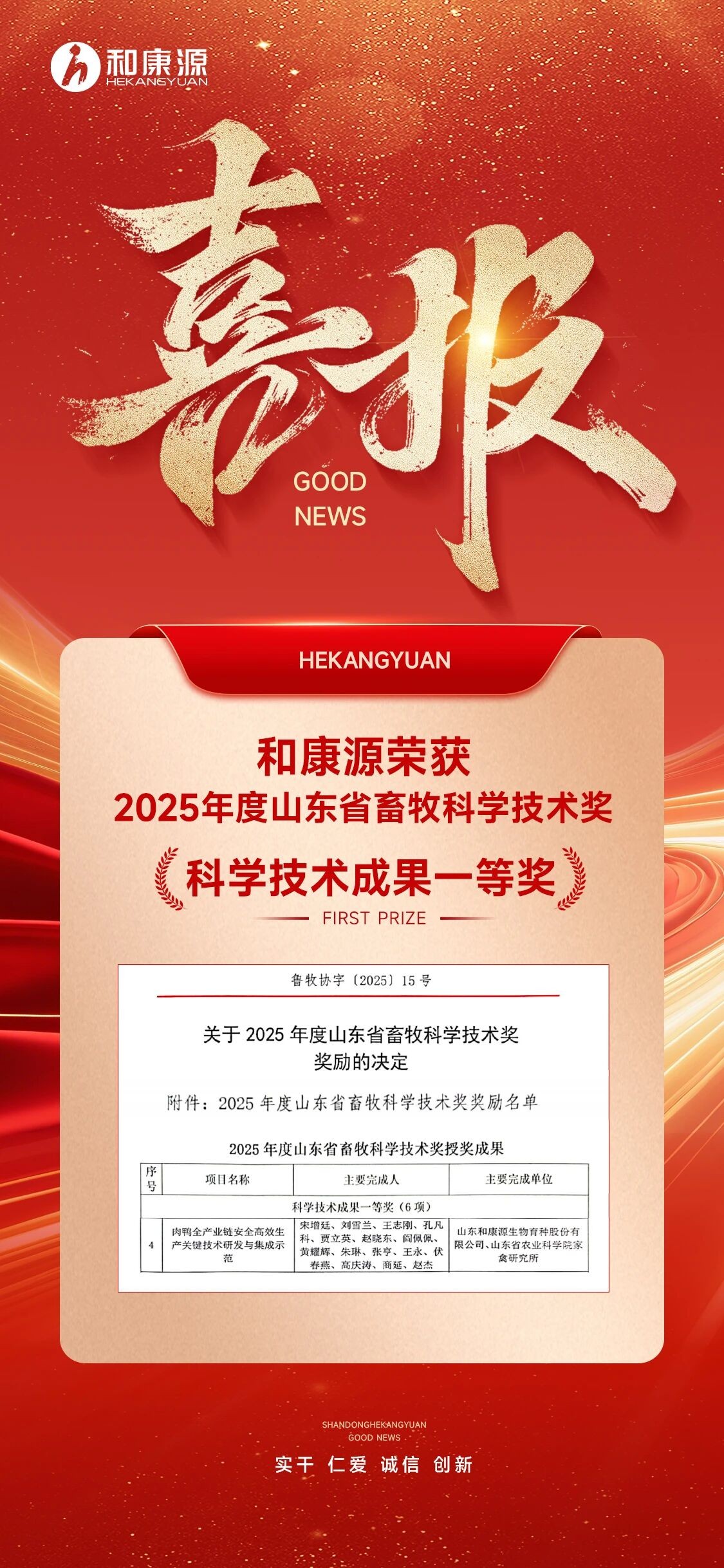 喜报 | 和康源荣获2025年山东省畜牧科学技术一等奖
