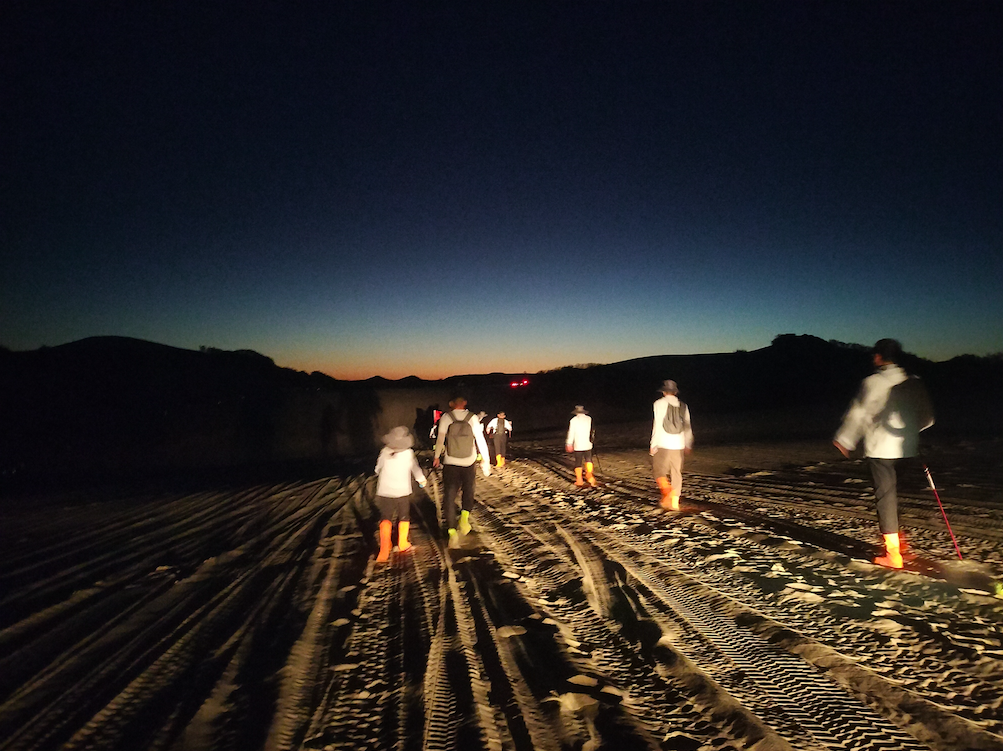 夜晚的沙漠,气温直线下降,夜空中的星星离我们显得特别近,在耗尽体力的最后一刻,到达了第一天的目的地——漠南民宿。晚餐结束后,大家各自总结分享一天的感受,尽管历尽风沙,但热情依旧饱满。