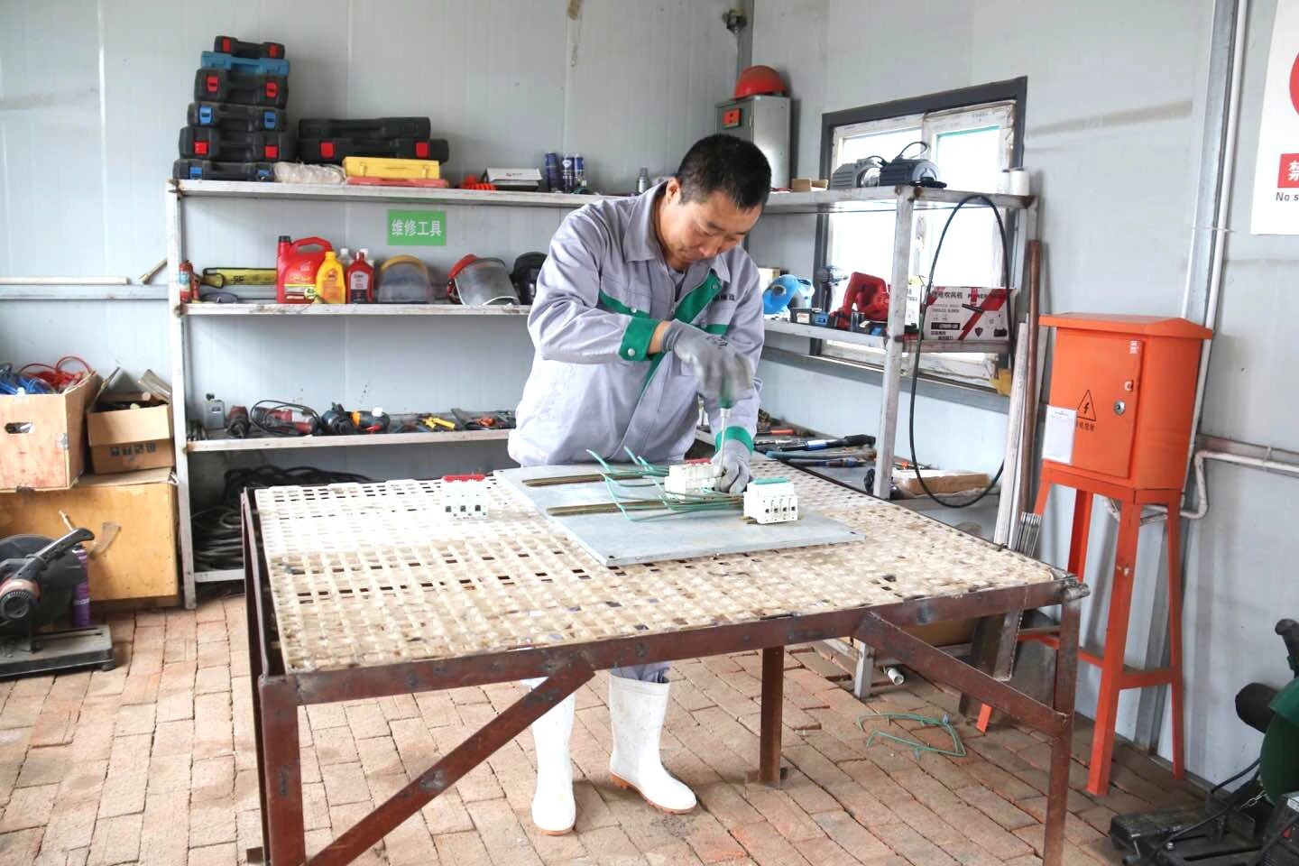 除了日常的维修工作,马师傅还时不时的帮忙场里的其他工作,我们见到马师傅的时候,正巧他帮忙装蛋车回来,马师傅说,哪里需要哪里干,大家一起装蛋车,确保鸭蛋能够及时地运往孵化场。随后,跟随马师傅走进不大的修理间,映入眼帘的是整整齐齐的维修工具,配件分类摆放,标签清晰明了,中间一个自制的工作台,干净整洁,这就是马师傅的工作小天地,整洁的工具间让我们对马师傅的工作颇有敬意。